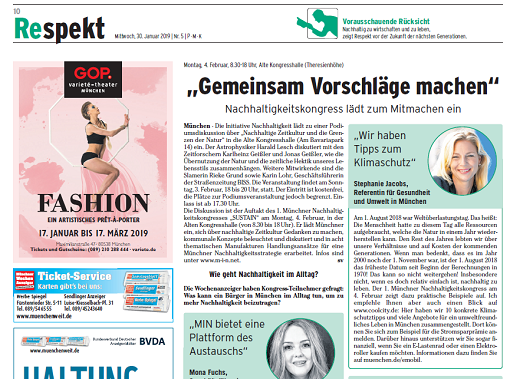 Nach dem ersten Artikel im Wochenanzeiger erschien nun der zweite Teil des spannenden Beitrags, bestehend aus Ratschlägen und Tipps von MünchnerInnen zu einer nachhaltigeren Lebensweise. Denn nicht allein die Poltik muss zum Handeln aufgefordert werden - jeder Einzelne hat hier eine Veranwortung und kann durch kleine Veränderungen Großes bewirken. Wie genau diese Veränderungen aussehen können, wird im Artikel genannt.